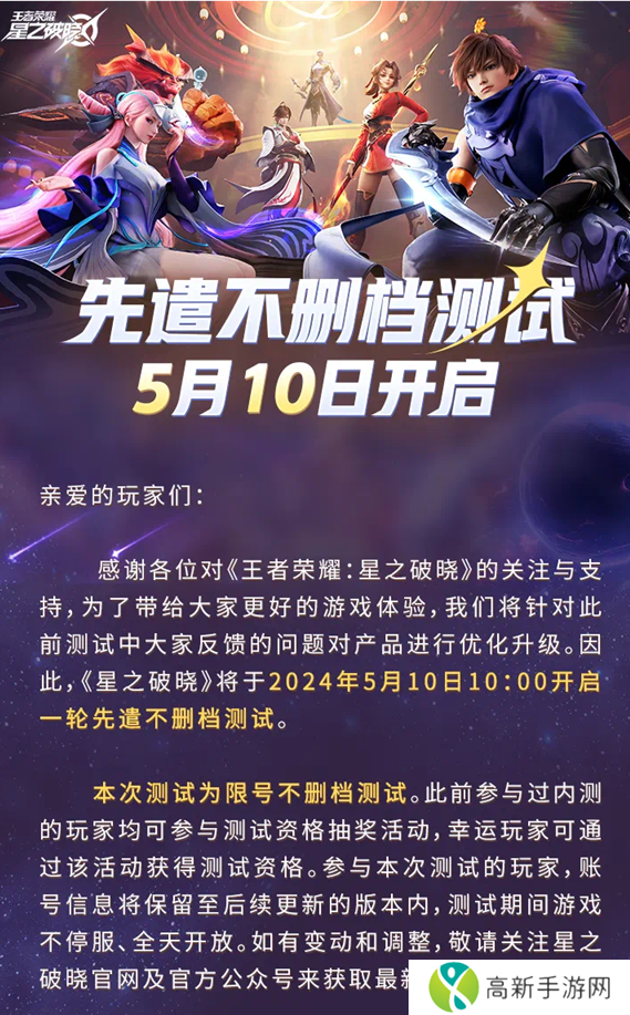 王者荣耀ip手游星之破晓在5月10日会进行新一轮的测试,本次测试的获取方式为抽奖获得,而且是在5月10日当天进行抽奖,此外星之破晓的正式上线时间在5月到6月期间。《星之破晓》在2024年5月10日10