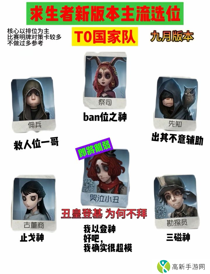 今日带来的是《第五人格》手游中各角色的求生强度排行,新版本的主流选位参考本榜单即可,榜单从T0开始到T3依次进行排行。T0:国家队,核心以排位为主,比赛明牌对策卡较多 T0 5:仅次于国家队,朴实无华