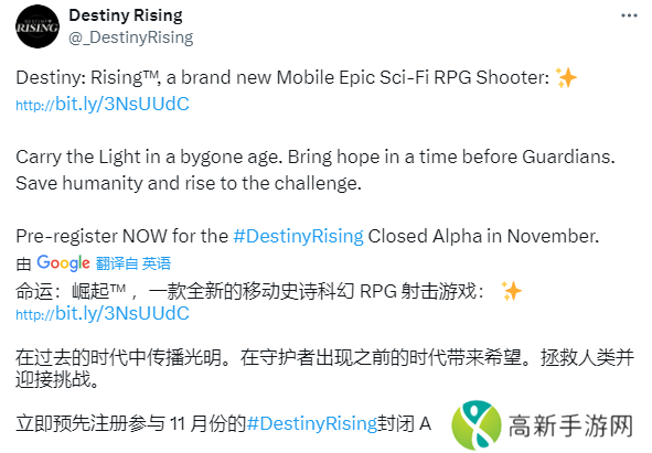 近日,网易与Bungie联合宣布,《命运:崛起(Destiny Rising)》游戏将于11月1日在海外启动Alpha测试,具体测试时间尚未确定。本次测试将面向美国和加拿大的玩家开放,测试资格将从官网