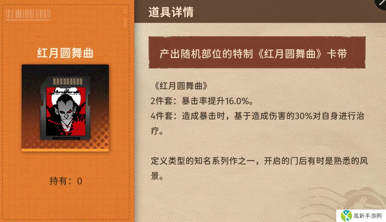 新月同行目前共有14种卡带,每种卡带除了套装效果不同外,在突破四阶段能刷出来的特殊词条也不一样。【红月圆舞曲】套装效果:特殊词条:坚壁:所受的群体伤害减少2 4%彻甲:造成暴击时,无视目标6%物理防御