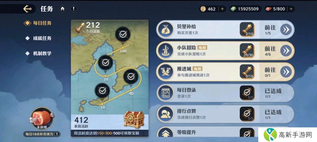 今日带来的是《航海王壮志雄心》的金币获取教程,目前来看金币获取方式一共有以下几种:1、每日任务活跃度达10,40,70分别可领20,20,50的金币数量,一共每日可获取90金币。每周活跃达150,30