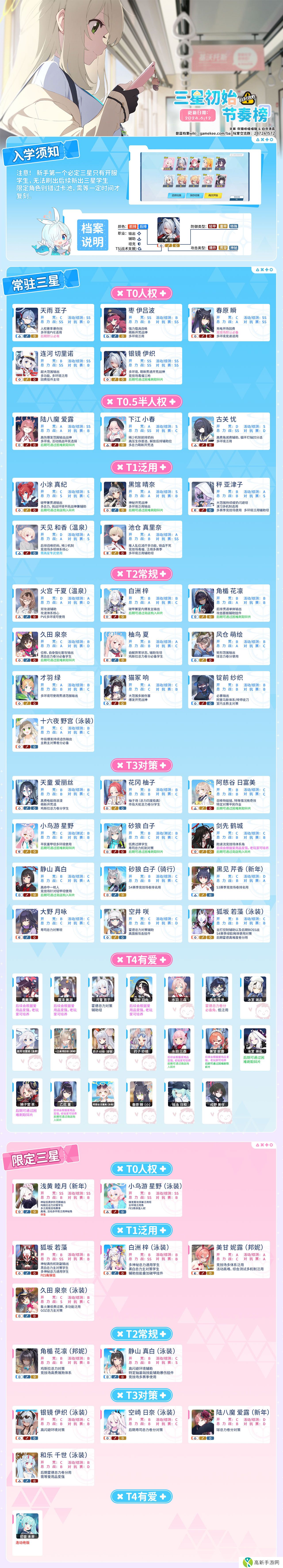 今日带来的事碧蓝档案国服(国服正式名为“蔚蓝档案”)三星初始、节奏榜,涵盖范围为新手开荒、总力战、活动高难 综合测试、对抗赛S3赛季,请根据自身玩法以及需求选择喜欢的学生! 注意!新手第一个必定三星只