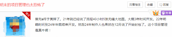 近日,贴吧上有玩家梳理了《明末:渊虚之羽》的开发时间线,感叹灵泽科技的项目管理做得很稳。2021年9月公布之初,灵泽CEO姜敏接受媒体采访时表示,《明末》预计会在3年之内问世。2022年,官方在回复