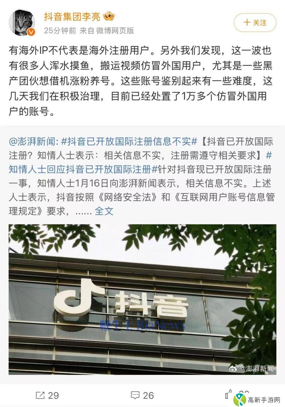 抖音集团李亮回应:已清理万余仿冒海外用户账号