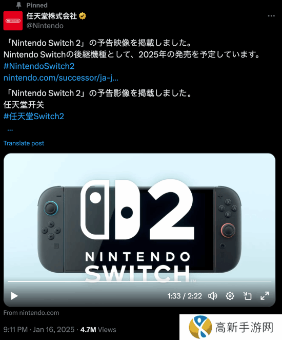 更多【Switch2正式公布】相关报道,点此查看>>>任天堂Switch新机终于在今晚正式公布,定名Switch2,今年年内发售。任天堂官方已将该消息置顶,在推特官号下方,网友们也炸锅了。在外型全面
