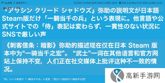 日前,我们曾报道过《刺客信条:影》日区Steam页面介绍出现改动,弥助不再被称作武士了。今日,日本媒体Gamespark也发现了这个情况,并进行了报道。在日区的Steam页面,“武士”一词被替换为“
