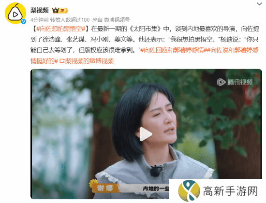 据梨视频报道,在最新一期的《太阳市集》中,谈到内地最喜欢的导演,向佐提到了徐浩峰、张艺谋、冯小刚、姜文等。他还表示:“我很想拍黑悟空。”且称自己想要出演。杨迪说:“你只能自己去筹划了,但版权应该很难