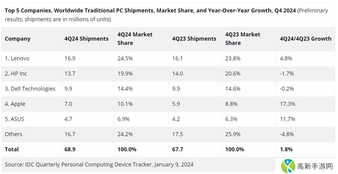2024年全球PC出货量微增,联想惠普戴尔苹果华硕领跑市场