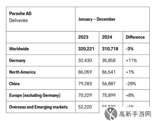 保时捷今日公布 2024 年交付数据,2024 年全球交付 310718 辆,同比下滑 3%。从地区来看,保时捷在欧洲(不包括德国市场)交付了 75899 辆汽车,同比增加