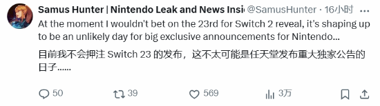 知名任天堂泄密者Samus Hunter近日发文表示,目前来看,1月23日不太可能成为任天堂公布Switch 2的日子。“目前我不会把赌注押在23日公布Switch 2上,这一天不太可能成为任天堂发