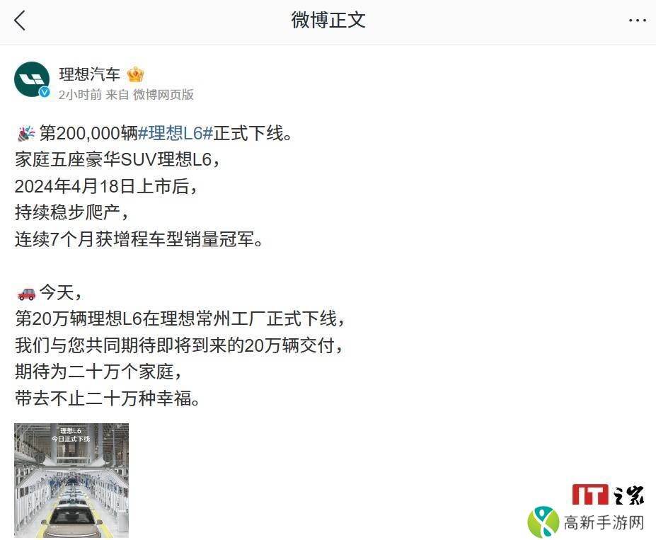 理想L6汽车喜迎20万辆下线,稳坐增程车销量冠军宝座7个月!