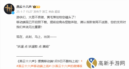 今日下午16:00,《燕云十六声》移动端预下载正式开启。游戏将于1月9日不删档上线。下载地址>>> 燕云十六声 的话题也登上了微博热搜。不少网友开始晒自己的捏脸,更有玩家直言“燕瘾”犯了。