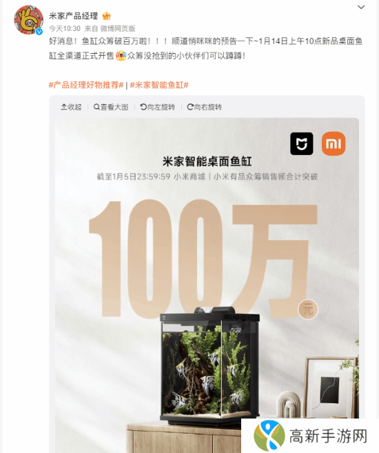 米家产品经理今日宣布,截止1月5日23:59:59,米家智能鱼缸在小米有品众筹销售额合计突破100万元。官方预告,1月14日上午10点新品桌面鱼缸全渠道将正式开售。米家智能鱼