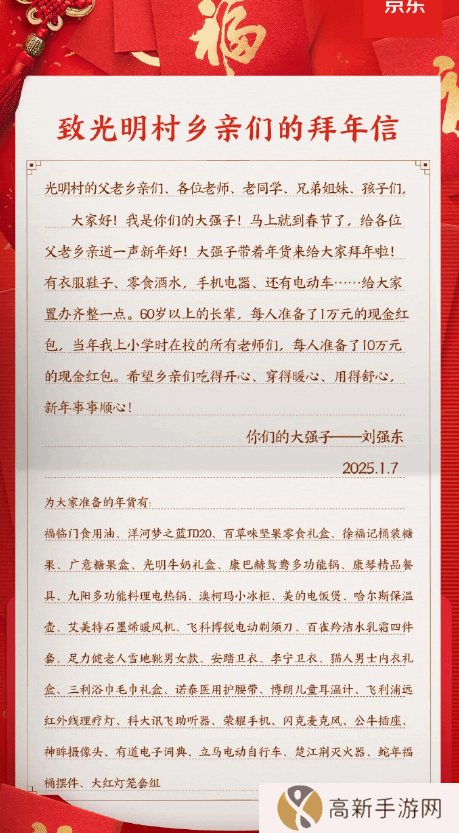 1月7日,刘强东在一封写给老家乡亲的拜年信中承诺:为自己在光明村读小学时所有在校老师每人准备了10万元的现金红包。据悉,刘强东今年仍会给家乡人民发放现金和年货,除老年手机、电