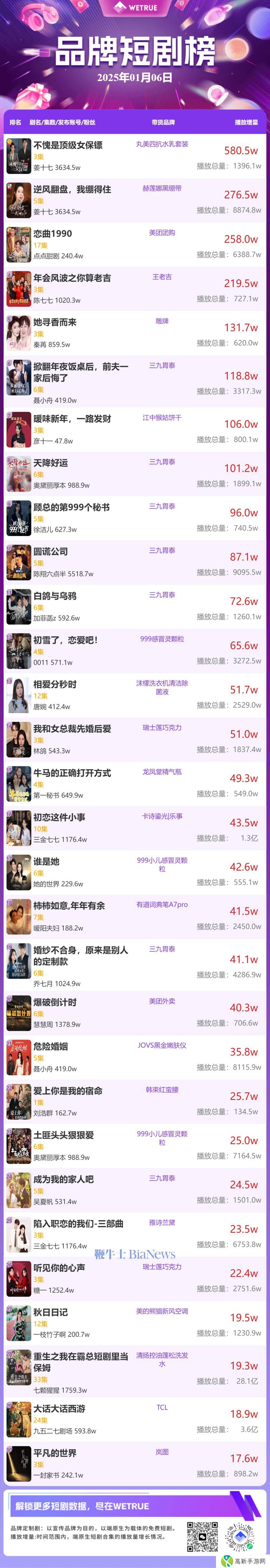 1月7日品牌短剧新榜出炉:《不愧是顶级女保镖》蝉联冠军