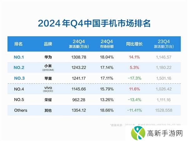 2024年Q4中国手机激活量榜:华为小米领跑,苹果同比大幅下滑