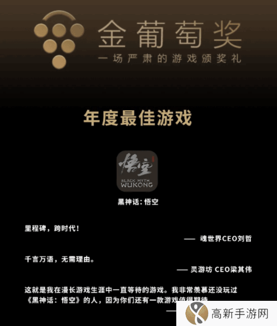 游戏葡萄举办的2024金葡萄奖评选结果现已揭晓,《黑神话:悟空》获得年度最佳游戏等多项大奖。来自行业内多家公司的近百位游戏人高度评价了《黑神话》,引发网友热议。很多玩家对业界大佬们的评价表示认可,称
