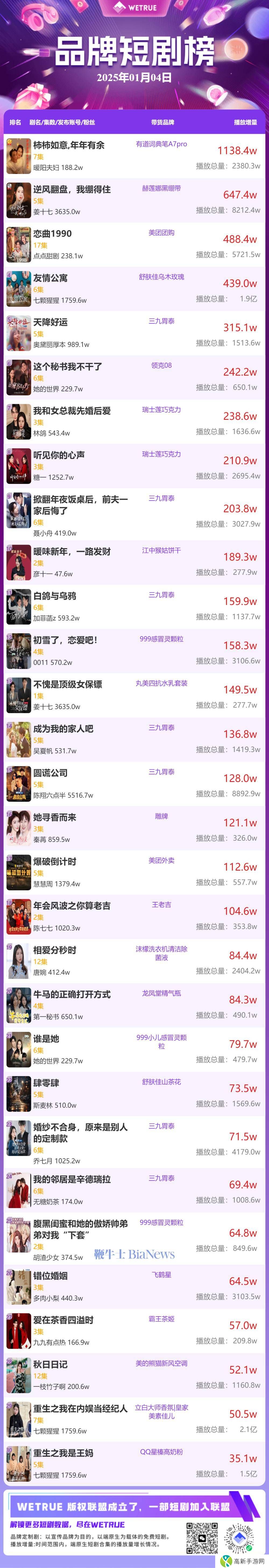 昨日品牌短剧热度榜出炉,《柿柿如意》领跑榜单前三甲