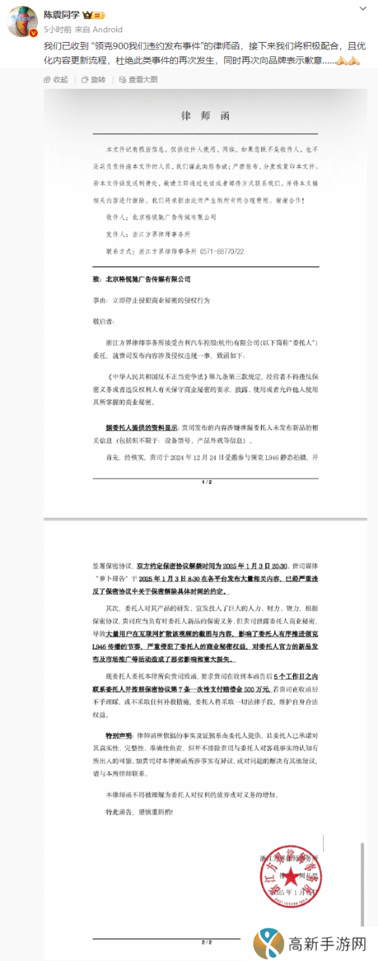 今日,汽车博主陈震在微博发文向领克致歉,其账号因提前泄露领克900(L946)车型信息,收到领克方面的律师函,并索赔500万元。其账号“萝卜报告”于2024年12月24日参与