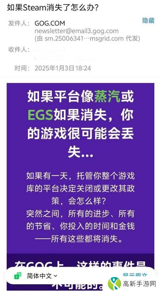 据网友爆料,CDPR旗下的GOG游戏平台于昨日向玩家发送推广邮件,标题为“如果Steam消失了怎么办”。正文中提到,如果Steam和Epic等游戏商店关闭的话,用户的数字版游戏很可能会丢失。购买游戏