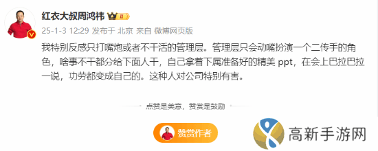 今日,360集团董事长周鸿祎在微博发文怒斥“只打嘴炮或者不干活的管理层”。他表示特别反感这样的管理层,只会动嘴扮演一个二传手的角色,啥事不干都分给下面人干,自己拿着下属准备好
