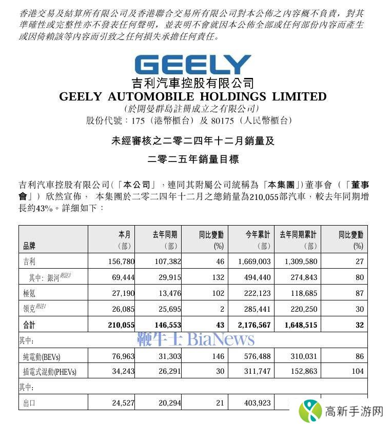 吉利汽车2024年销量大增32%,2025年目标直指271万辆