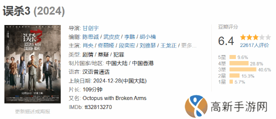 今日,由肖央主演的犯罪悬疑新片《误杀3》豆瓣开分6 4分。5星仅占比9 6%,4星占比28 8%,3星占比40 6%,2星占比15 3%,1星占比5 7%。给出好评的观众表示很真实的