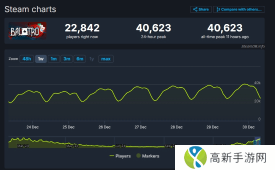 自从在TGA 2024颁奖典礼上荣获多个奖项以来,独立游戏《小丑牌》的热度持续高涨。在Steam平台的在线玩家人数也创下新高。近日,该作的Steam同时在线玩家峰值突破了40623人,超越了今年2月