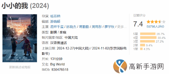 更多【易烊千玺演 "脑瘫 "】相关报道,点击这里查看>>>今日,由易烊千玺主演的《小小的我》豆瓣开分,59917人打出7 4分。5星占比28 7%,4星占比30 4%,3星占比27 2%