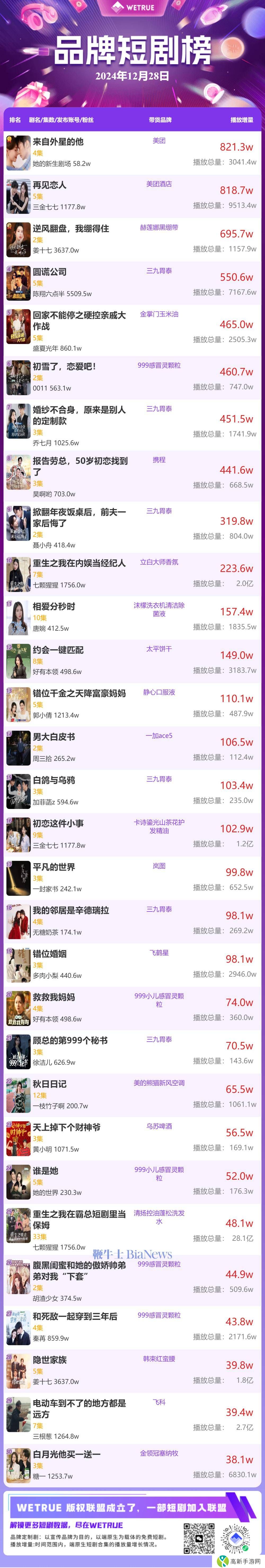 12月29日品牌短剧热度榜揭晓,《来自外星的他》再度领跑!