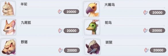 不同系职业可用水晶购买的坐骑不同,剑士系可购买大嘴鸟,服事系可购买羊驼,魔法系可购买九尾狐,弓箭手系可购买鸵鸟,盗贼系可购买斑鬣,商人系可购买野猪。