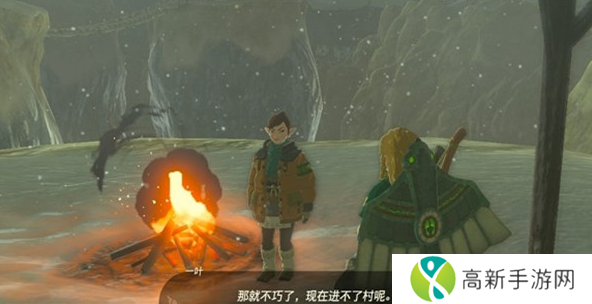 2、不过想要进入利特村的桥梁断掉了,这里需要利用风流飞过去,在这里会看到一叶在篝火旁边,我们丢进海拉鲁球果进篝火堆里。