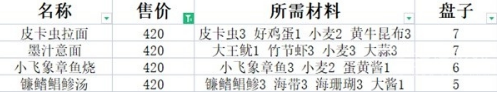 皮卡虫拉面和镰鳍鲳鲹汤要海菜,墨汁意面一份要消耗高达6个蔬菜,不过一级就能出七份。