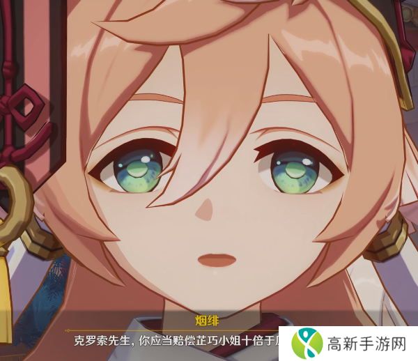 (5)与芷巧一同找到克罗索后,克罗索请烟绯帮忙评估钗子的赔偿价格,而烟绯表示需要先进行调查,请克罗索稍等片刻,但在对话的最后,烟绯又请芷巧去个方便的地方聊一聊。