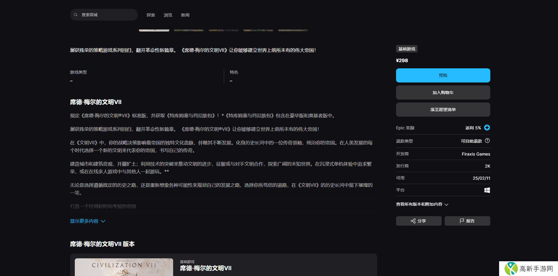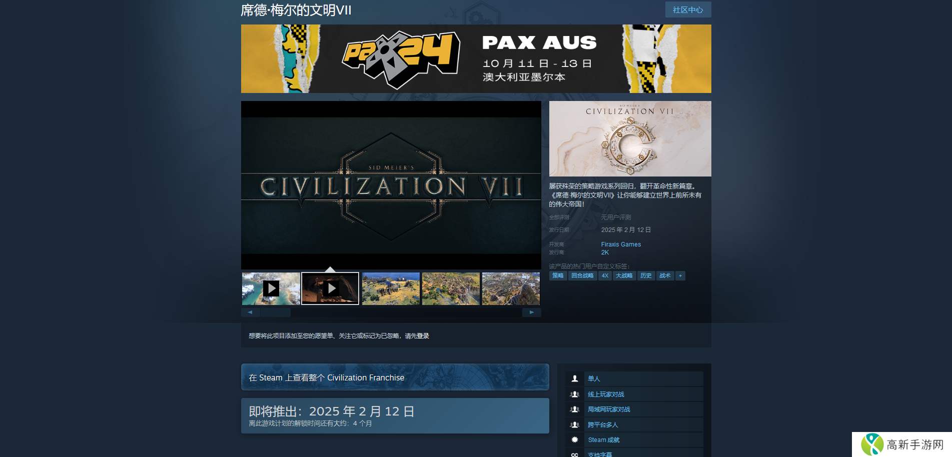 《席德·梅尔的文明VII》Steam版的上线时间为2025 年 2 月 12 日上午10点,预载时间大概是前一天,也就是2月11日。