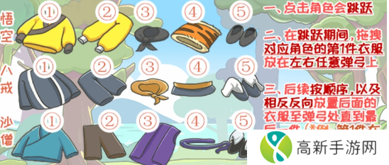 2、在跳跃期间,拖拽对应角色的第1件衣服,放在左右任意弹弓上。