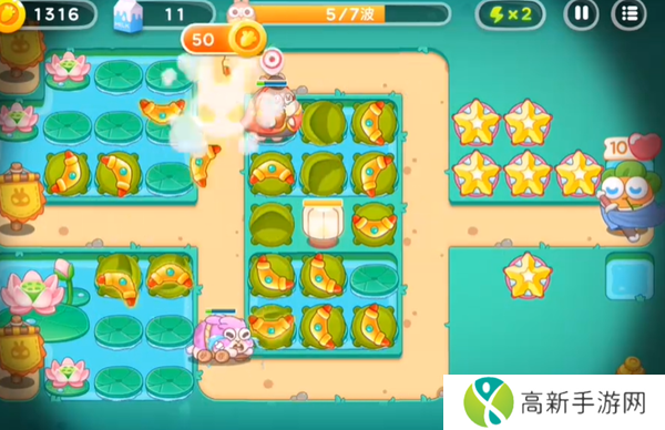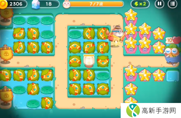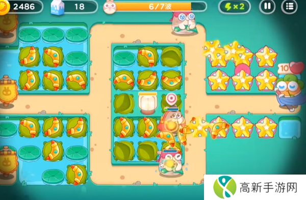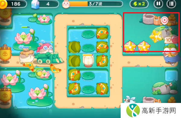 3、将中间水池上的格子都放置好回旋镖之后,开始在右边建造星星炮塔,利用星星炮塔拆除道具,为后续的布局创造更好的条件。