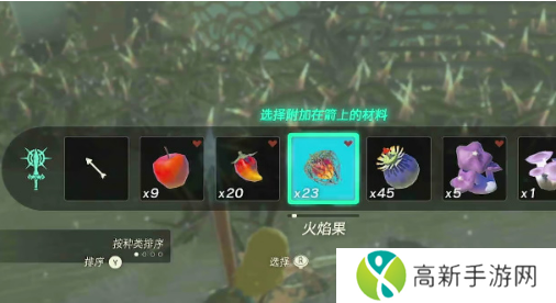 2、因为是下雪天,所以我们使用火焰果也是可以的,将火焰果附加在箭上面,然后射出去的箭就有了燃烧的作用。