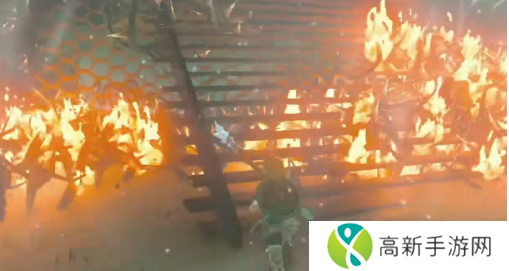3、对准这些荆棘处,然后将附加了火焰果的箭射进去,这周围就是都会燃烧起来,等待烧完有了路就行了。