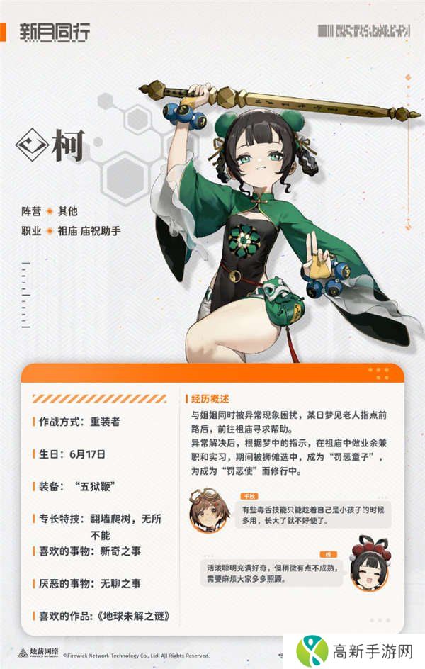 新月同行柯角色技能介绍,重装柯怎么样。与姐姐同时被异常现象困扰,某日梦见老人指点前路后,前往祖庙寻求帮助。