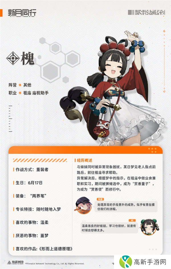 新月同行槐角色介绍,重装者槐技能介绍。与妹妹同时被异常现象困扰,某日梦见老人指点前路后,前往祖庙寻求帮助。异常解决后,根据梦中的指示,在祖庙中做业余兼职和实习,期间被狮傩选中,成为“赏善童