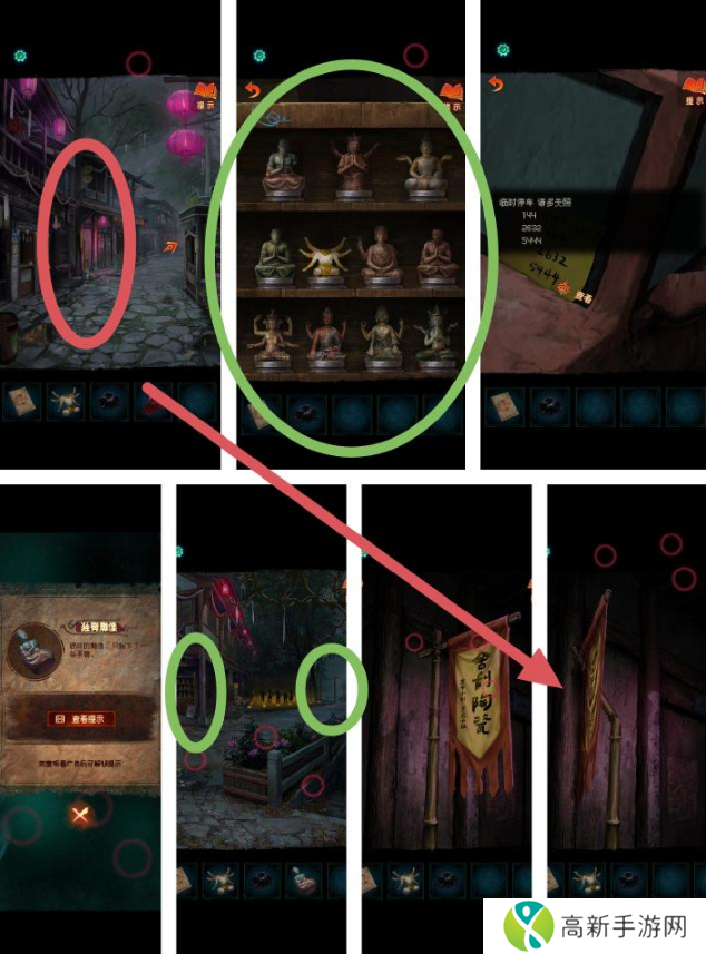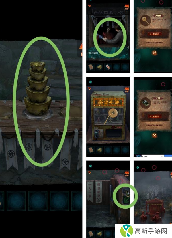 23、(魁阙关内)点击左侧怪人抬着的担子,放上【纸元宝】,完成汉诺塔小游戏;触发机关,注意布条上的图案及位置