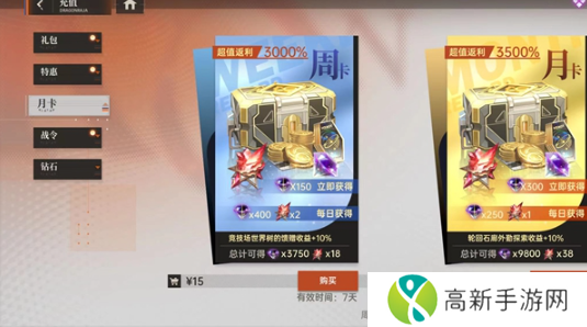 2、月卡周卡:在商店自行选择购买周卡或月卡,获取超值返利。