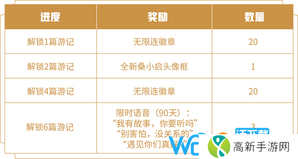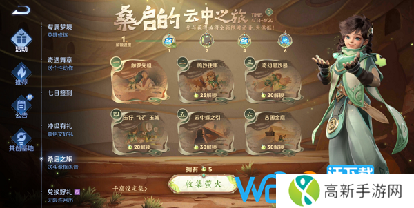 (一)活动期间,完成任务即可获得“萤火”,解锁桑启的云中游记。游记需按顺序解锁,累计解锁1、2、4、6篇游记,可领取对应奖励。