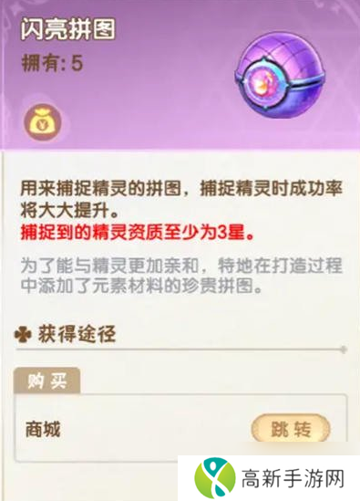 如果希望获得一只高资质精灵,最简单的方式就是使用高品质拼图进行捕捉,例如“闪亮拼图”捕捉到的精灵资质至少为3星,基础属性值比较高