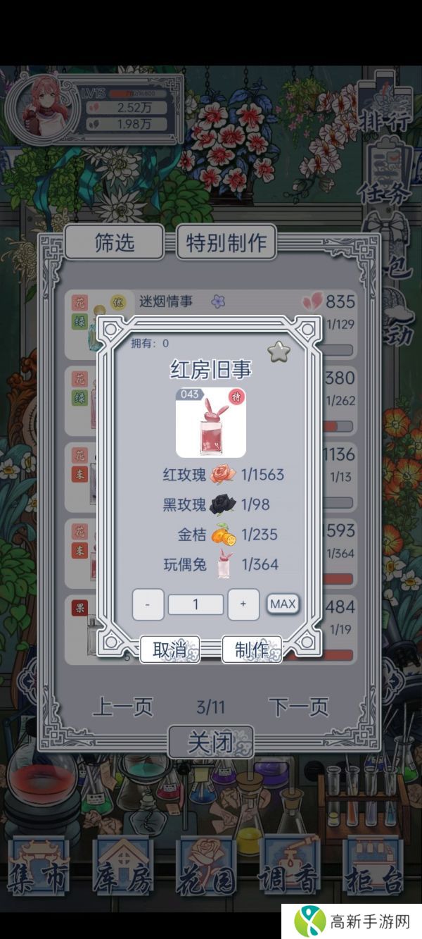 建议二:完成一级考试以后,可以选择刷红房旧事。种植植物种类为红玫瑰,黑玫瑰和金桔三个植物成熟时间很快,虽然玩偶兔瓶比较贵,但是总体售价是瓶子两倍以上可以迅速回本。