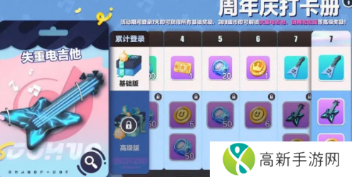 9、6月9日至7月6日蛋仔们累计登录7日即可在【周年庆打卡册】免费领取瓶盖、潮流纤维、金币、盲盒染色剂、巅峰派对福利卡和全新乐器【强音电吉他】、解锁高级打卡册还可获得潮流纤维、动作【啦啦操】、许愿币*30和乐器【失重电吉他】奖励。