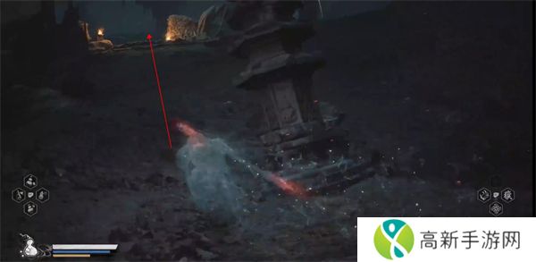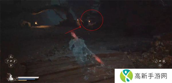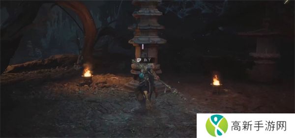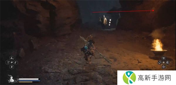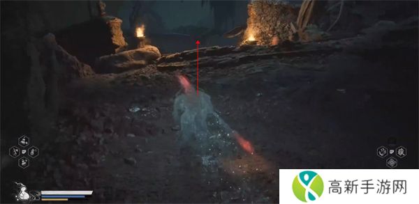 5、上去后,会看到点着两盏火的通道,进去里面然后向右边看,第三张紫符就在那。