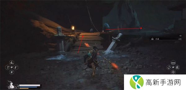 8、上了阶梯之后,你会看到一个一座桥,过了这座桥后往右边走,就可以触发剧情撕下第一张紫符。