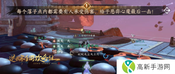 3.第一轮对弈:走落子机制,躲避会移动的黑棋攻击(红圈提示),需要大家分配好位置,不要重复落子,落子结束后BOSS虚弱,去中间放绝技输出即可。
